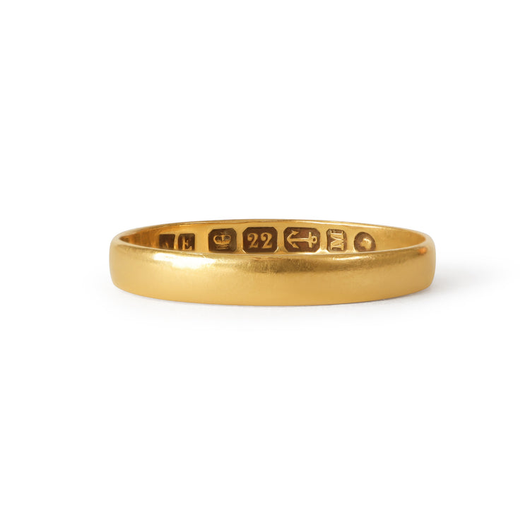 During the Victorian period, simple gold bands like this one were widely exchanged as wedding or commitment rings, often inscribed with personal sentiments or initials within the shank. The tradition of marking gold purity and origin through British hallmarks provided both assurance of quality and a record of craftsmanship.