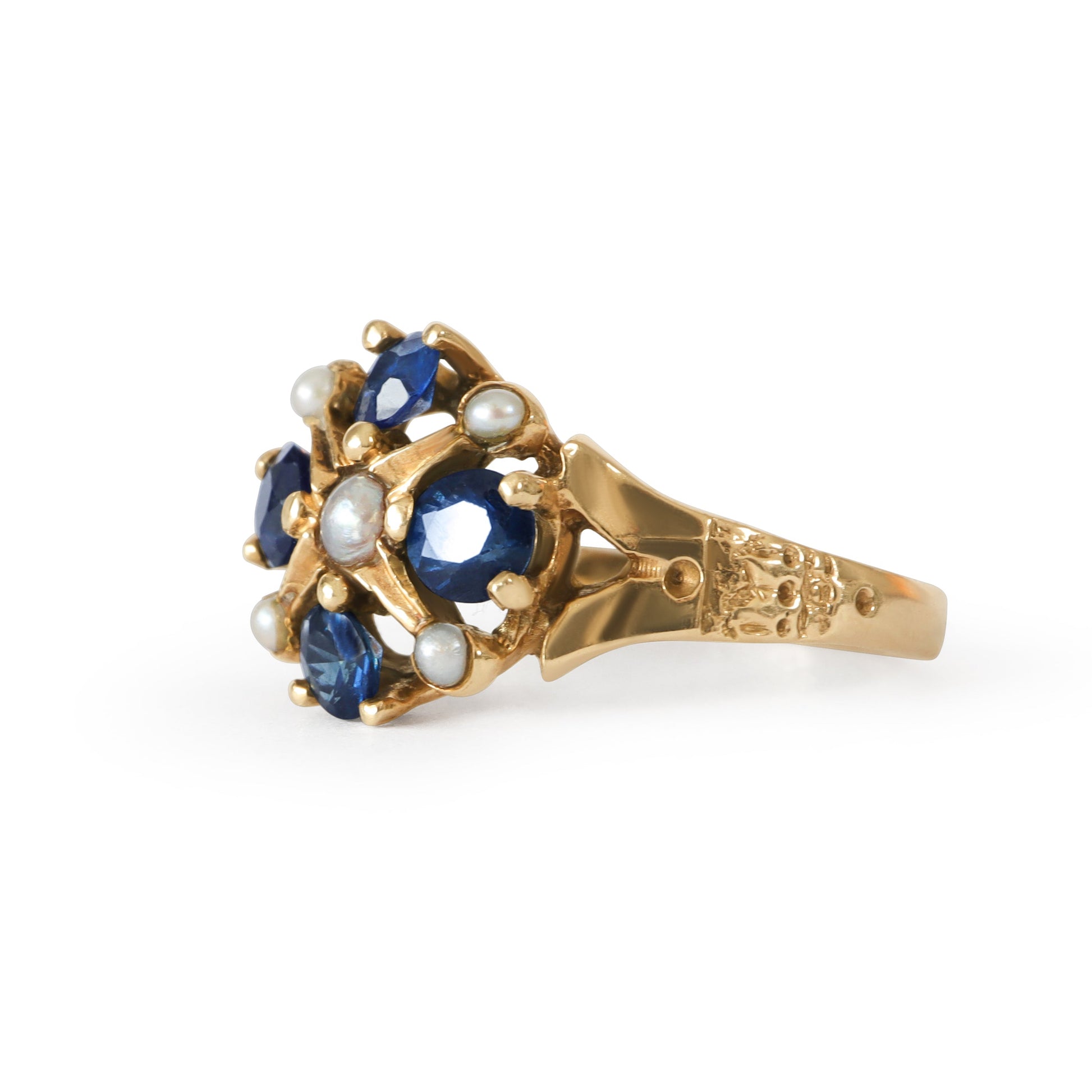 Sapphires and pearls were a favored pairing in the Victorian era, symbolizing loyalty, wisdom, and purity of thought. Seed pearls, prized for their gentle luster and organic character, were often used to soften the brilliance of colored gemstones. The symmetrical cluster and engraved shoulders reflect the period’s love of natural motifs and finely balanced design.