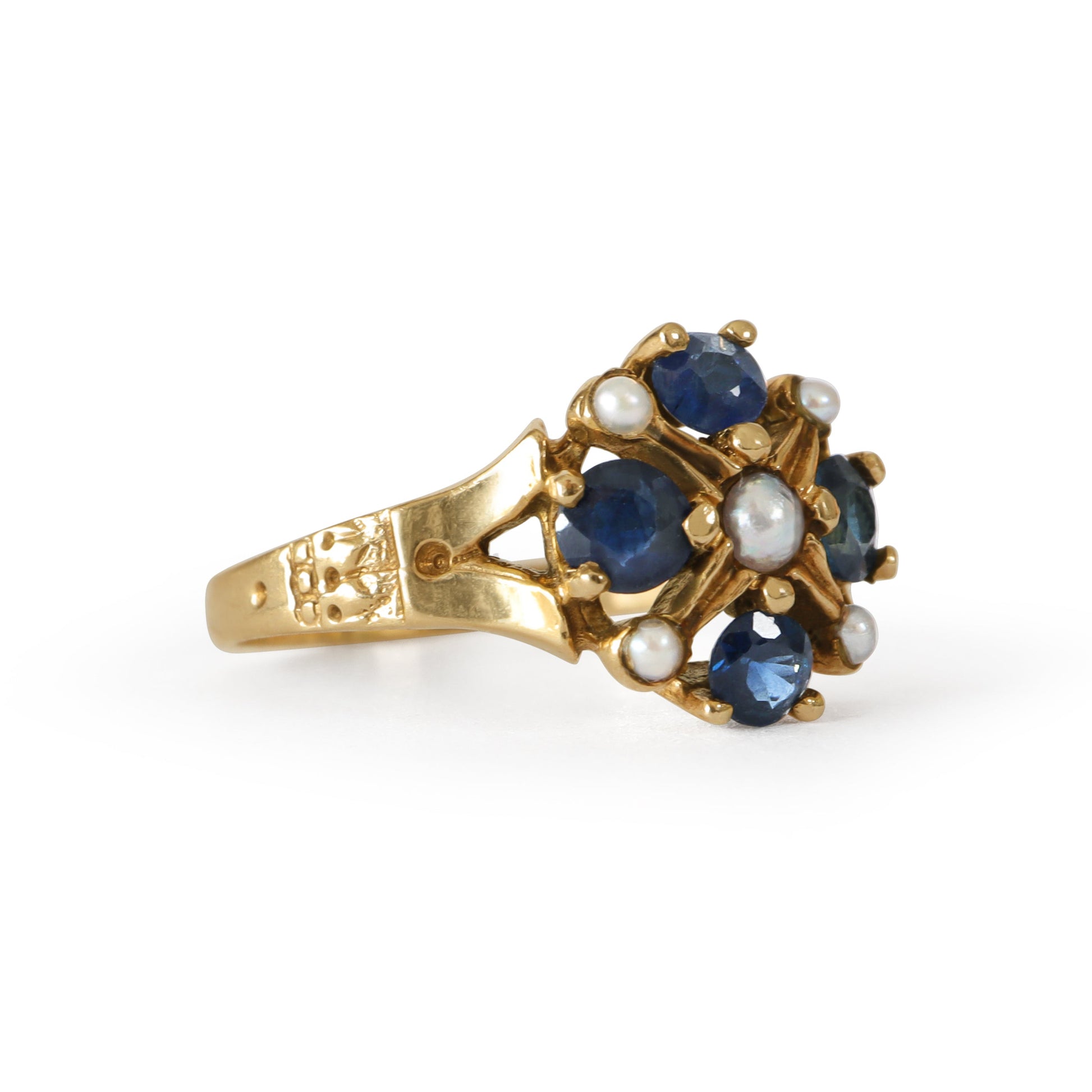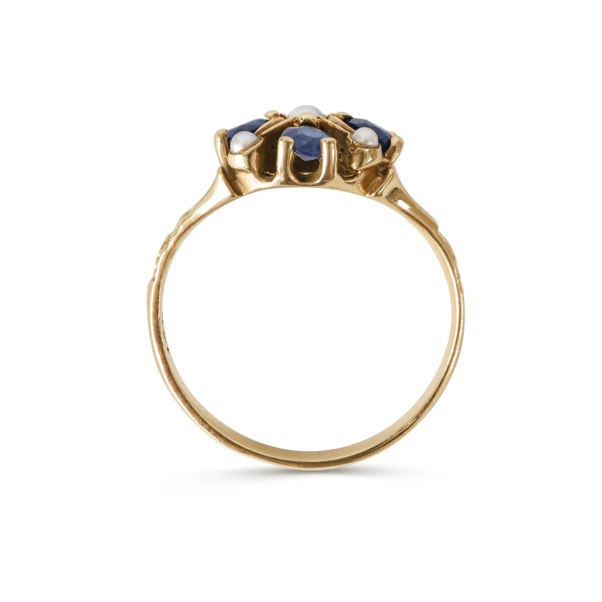 This late Victorian ring features four round sapphires totaling approximately 0.50 carat, accented by five grey seed pearls arranged in a floral cluster. Crafted in 14 karat gold and bearing a partial hallmark, it embodies the delicate romanticism that defined jewelry of the 1880s.