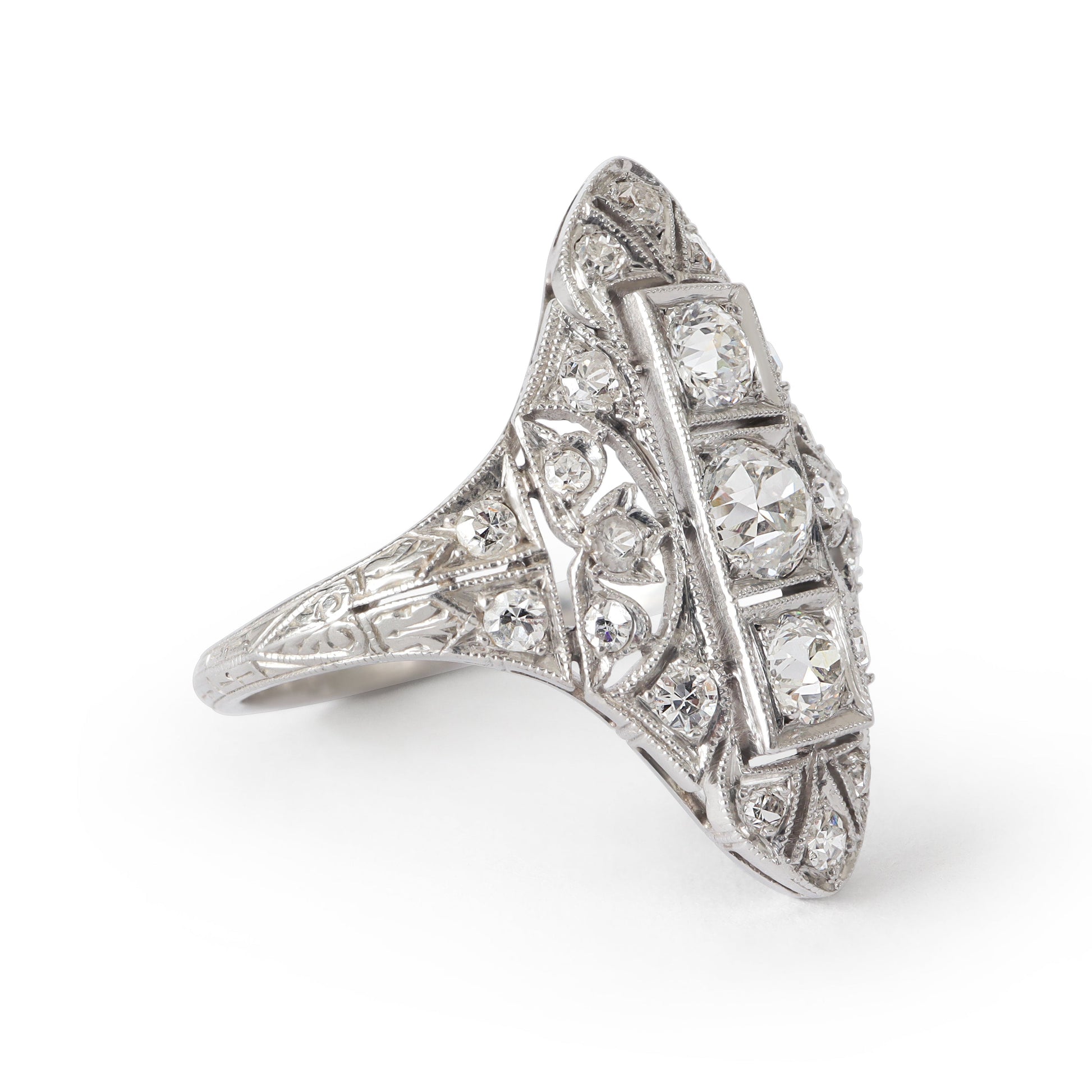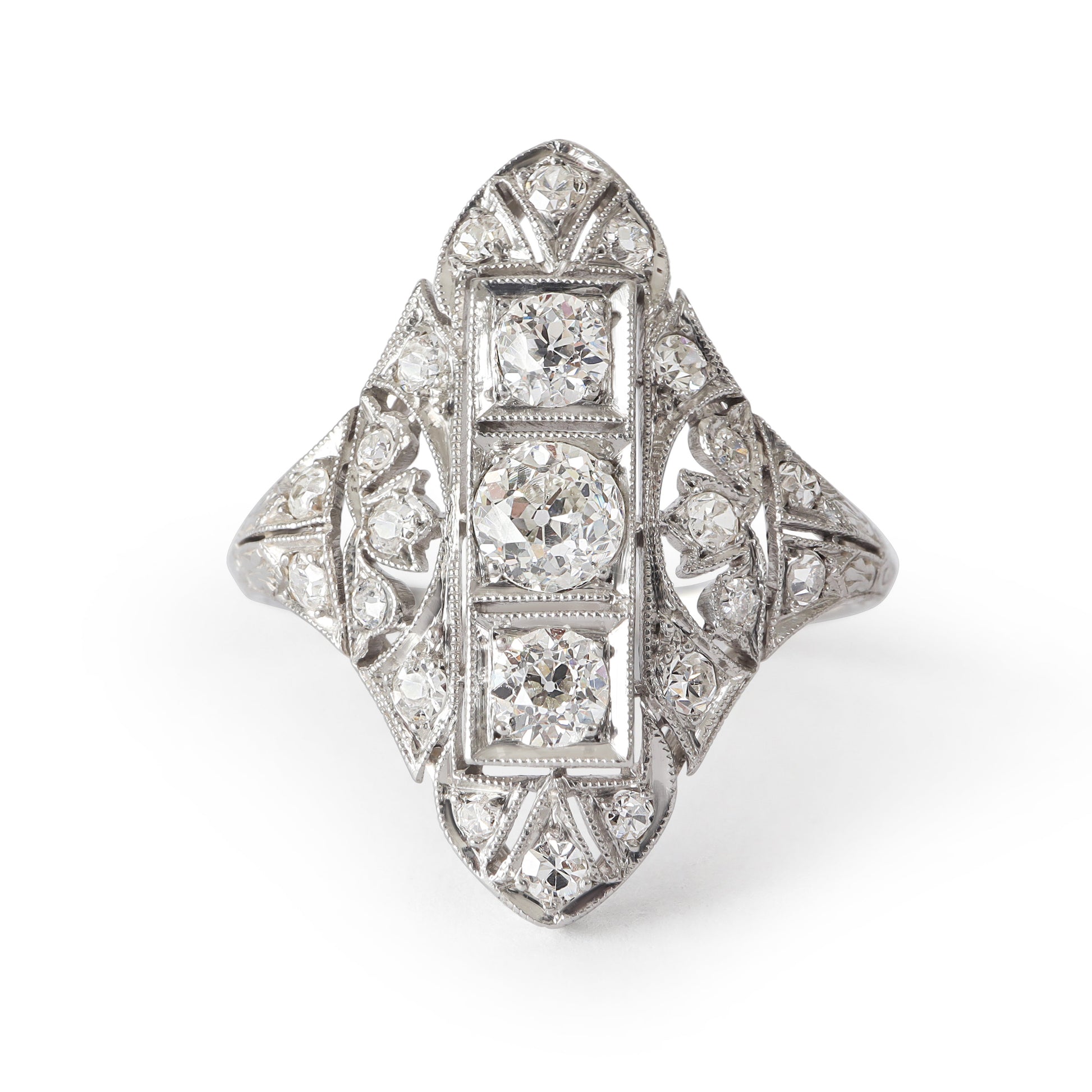 This Art Deco ring is designed in the distinctive shield shape of the 1920s, centering three old European cut diamonds totaling approximately 0.65 carat, framed by twenty antique single cuts weighing approximately 0.60 carat in total. The stones are set in platinum with fine milgrain detailing and intricate openwork, exemplifying the exceptional craftsmanship of the period.