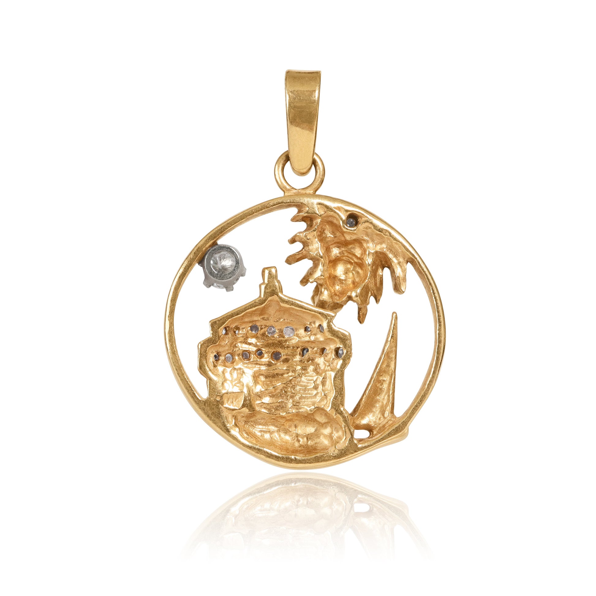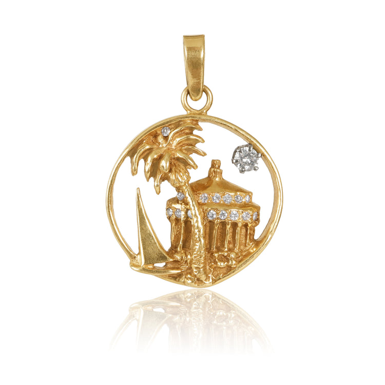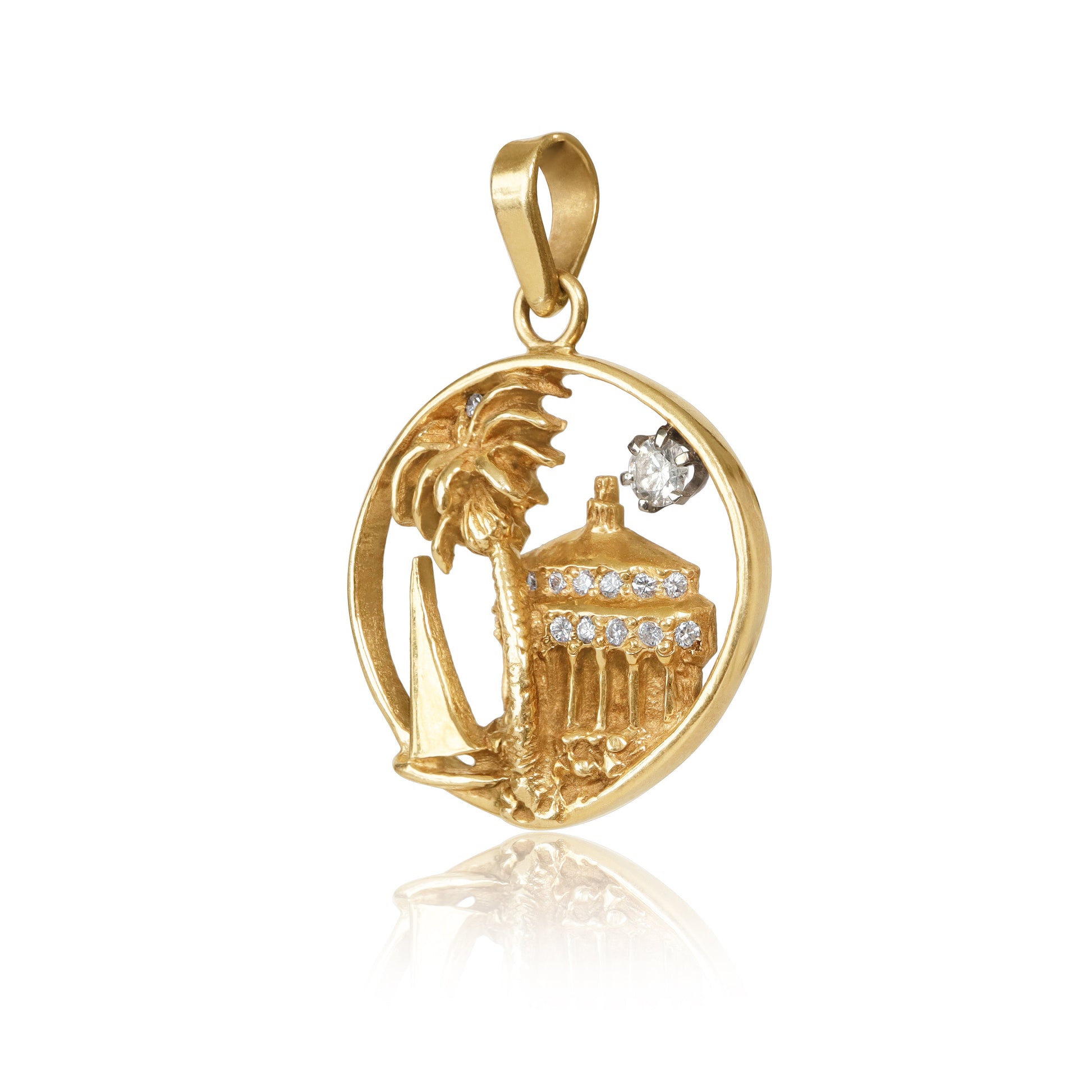 Evoking the sunlit glamour of California’s coastal escapes, this charm features Catalina Island’s iconic Casino framed by a palm and sailboat, all rendered in 14 karat gold and accented with seventeen round brilliant cut diamonds totaling approximately 0.60 carat. The Casino, completed in 1929, quickly became a symbol of Catalina’s golden era, drawing Hollywood stars and travelers to its shores.