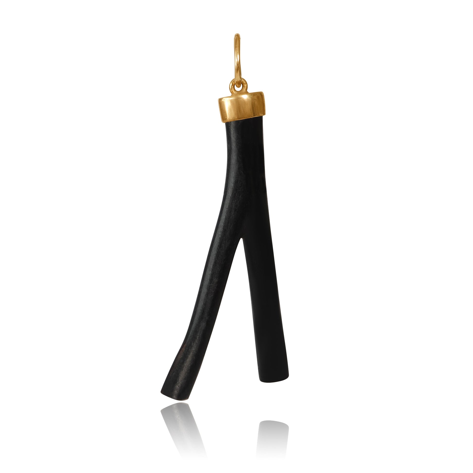 Carved from rich black ebony with a polished 18k gold cap, this mid-century pendant is a striking reinterpretation of the traditional coral branch form, long considered a symbol of protection in Italian culture. The use of ebony, a material prized for its deep hue and smooth luster, offered a refined, modern alternative to coral during the 1950s and 1960s when natural coral became increasingly difficult to source. Most likely of Italian origin, circa 1960.