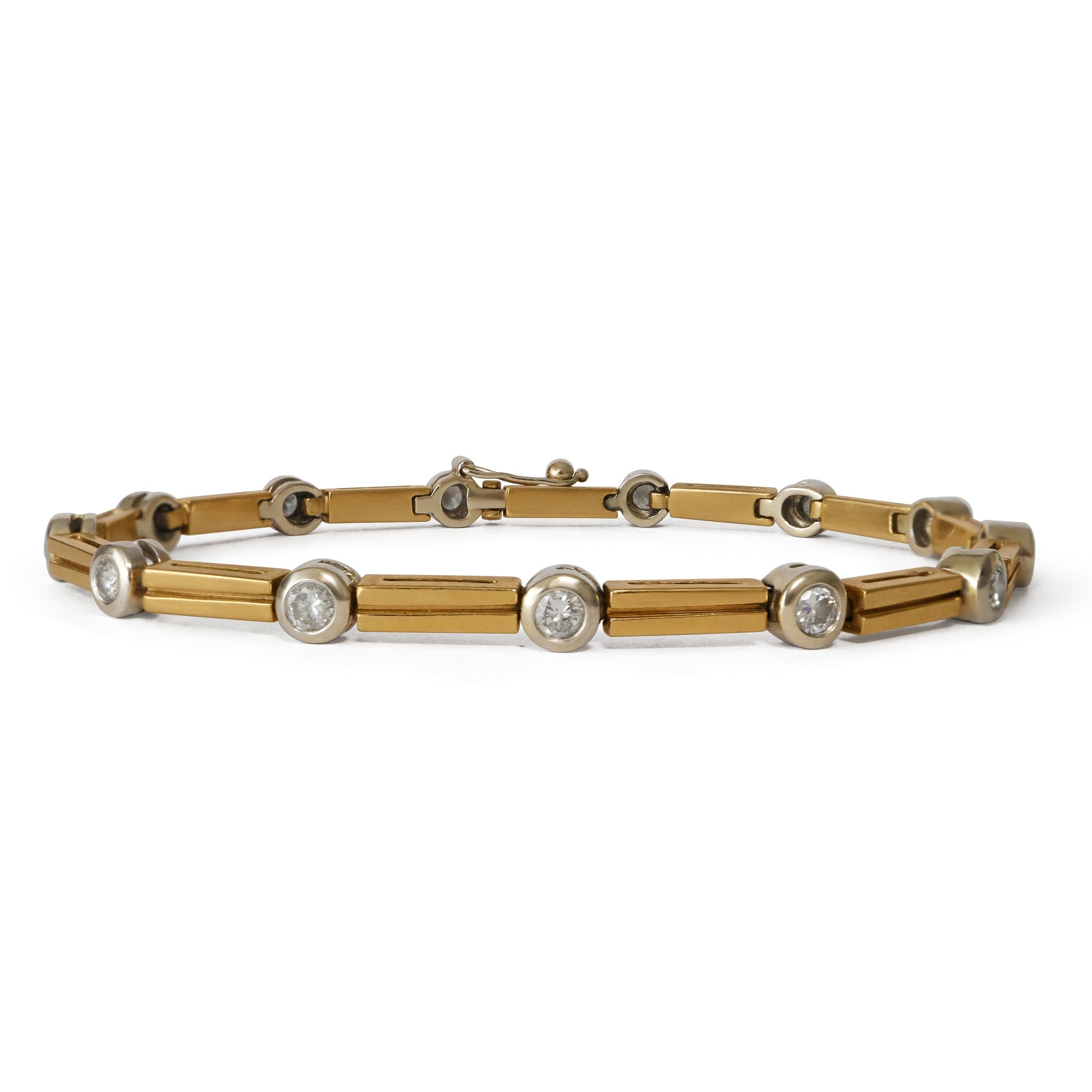 This elegant bracelet features thirteen round brilliant cut diamonds weighing approximately 1.30 carats in total, graded H–I color and SI clarity. The diamonds are bezel set in white gold between polished 18 karat yellow gold bar links, creating a refined contrast of tones. The bracelet bears an Italian mark, as well hallmark for 18 karat gold and has been tested for purity.